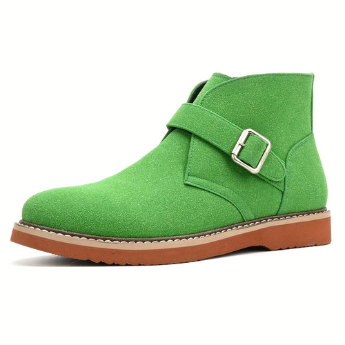 Men's High-Top Chelsea Boots with Brogue Detailing - Fashionable & Business-Oriented, Solid Color Elastic Band Slip-On Shoes with Double Buckle, Round Toe PU-Lined Fabric Upper with Rubber Sole.