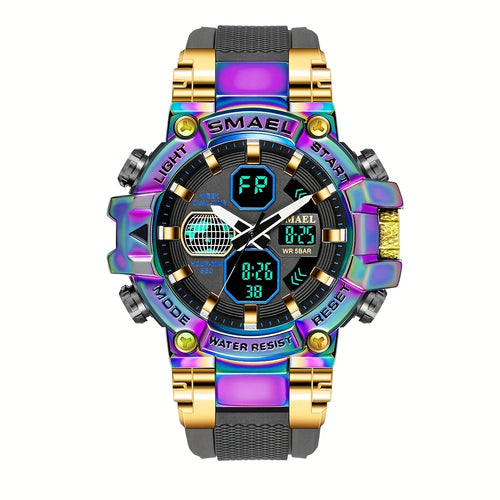 Men's Mechanical Sports Watch - Dual Display Dial with Stopwatch, Alarm, Date/Calendar, Auto Winding Movement - Green to Red Gradient Dial, Golden-Tone Case & Silicone-like Strap - for Gym, Outdoor, Everyday - Ideal Gift for