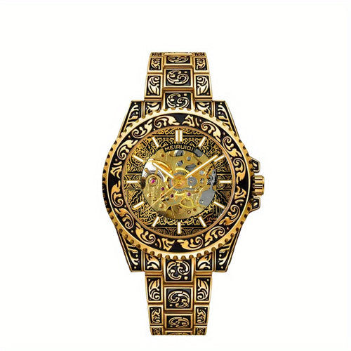 Men's Yellow Steel Band Vintage Bar Scale Tourbillon Fully Automatic Hollow Mechanical Watch, Without Battery.